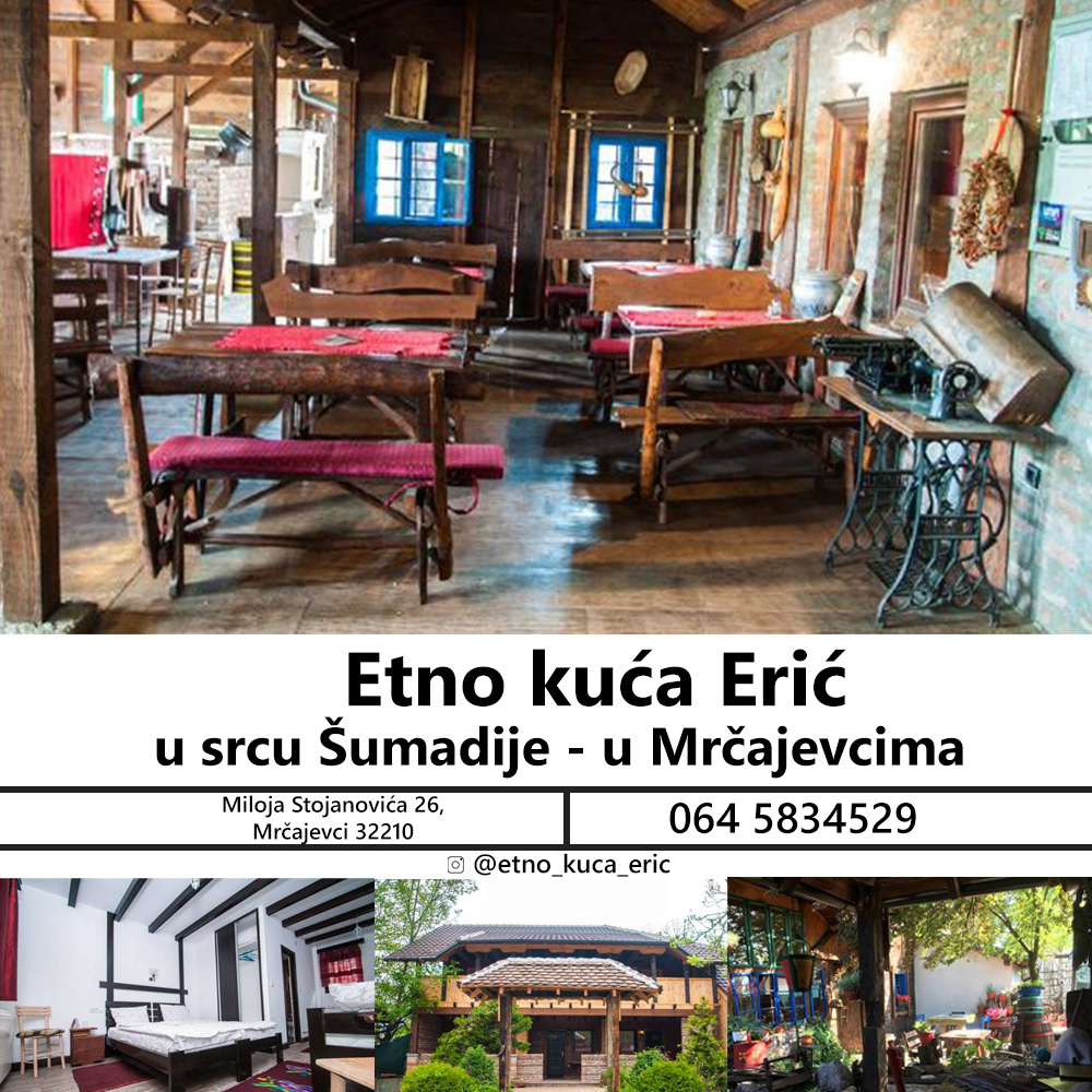 Sobe Erić i Etno kuća Erić, smeštene su u malom, ali naveliko poznatom mestu u srcu Šumadije - u Mrčajevcima. Nalazi se na raskrsnici svih puteva u Srbiji. Na Ibarskoj magistrali od Beograda do Niša, od Čačka do Kragujevca, od Zlatibora do Kopaonika. Postali smo prepoznatljivi kako ambijentom, tako i ukusom domaće srpske kuhinje. Spojili smo tradiciju i nostalgiju za starim, minulim vremenima sa potrebama modernog doba.
