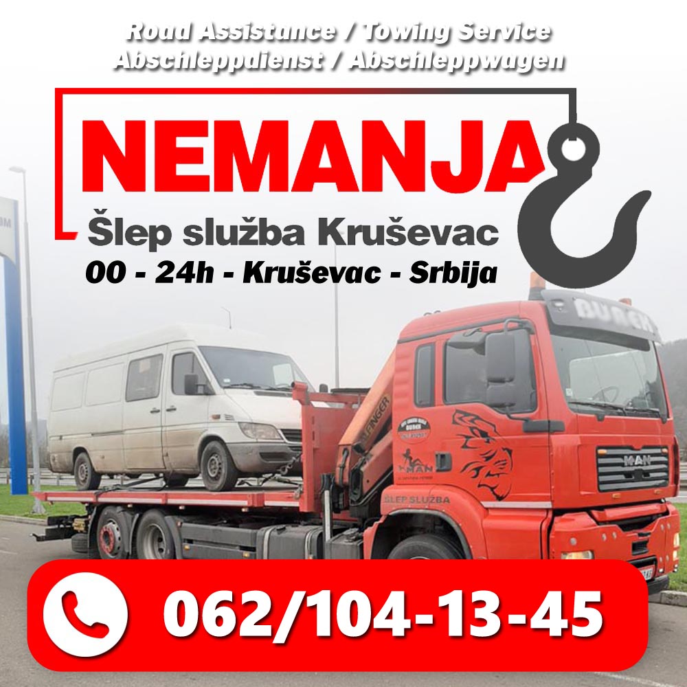 Šlep služba Kruševac - Kamion sa kranom je vaš pouzdan partner na putu koji pruža širok spektar usluga šlepanja vozila. Sa 20+ godina iskustva, nudimo efikasnu i profesionalnu pomoć kako u zemlji, tako i u inostranstvu. Naša primarna svrha je pružiti vam ne samo pomoć, već i osećaj sigurnosti i pouzdanosti kad se nađete u nevolji na putu. Disponibilni smo 24 sata dnevno, 365 dana u godini, spremni da odgovorimo na vaše pozive i pružimo neophodnu podršku kada vam je najpotrebnija. Uz kontakt broj 062/104-13-45, stojimo vam na raspolaganju za bilo kakve situacije - od sitnih kvarova do ozbiljnijih saobraćajnih nesreća. Naš vozni park je opremljen najsavremenijom opremom za šlepanje, omogućavajući nam da efikasno i bezbedno prevezemo vaše vozilo do odredišta po vašem izboru. Svestrani tim iskusnih vozača garantuje brzu reakciju i dolazak na mesto događaja u najkraćem mogućem roku. Takođe, sarađujemo s velikim brojem auto servisa kako bismo vam omogućili brzu popravku i ponudili profesionalno rešenje za vaše vozilo nakon šlepanja. Bez obzira na vrstu kvara ili problem s vozilom, naš tim će se potruditi da vam pruži rešenje koje će vas brzo vratiti na put. Kada se suočite s nevoljom na putu, Šlep služba Kruševac - Kamion sa kranom je tu da vam pruži podršku i rešenje problema. Pozovite nas u bilo koje doba dana ili noći, jer vaše zadovoljstvo i bezbednost su naš prioritet.